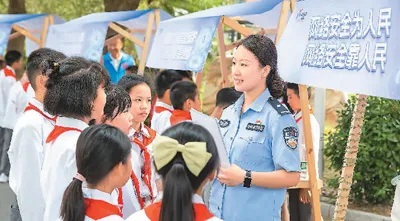 江蘇省海安經(jīng)濟(jì)開發(fā)區(qū)實驗小學(xué)校園內(nèi),民警向?qū)W生講解未成年人網(wǎng)絡(luò)保護(hù)知識。翟慧勇攝(人民視覺)