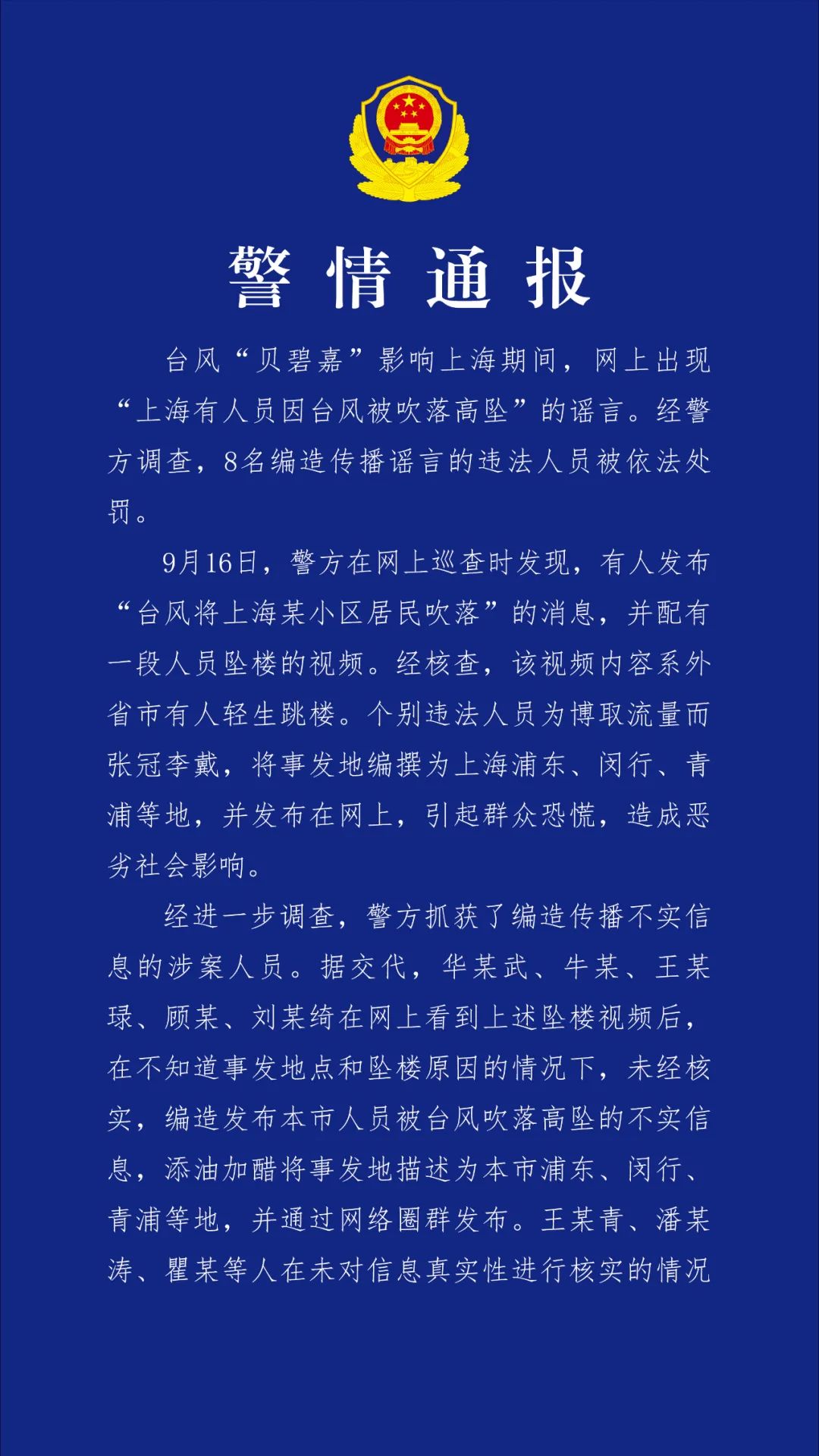 市公安局介紹,8名編造傳播“本市有人員因臺(tái)風(fēng)被吹落高墜”謠言的違法人員被依法查處。互聯(lián)網(wǎng)不是法外之地,市民群眾應(yīng)依法依規(guī)文明上網(wǎng),加強(qiáng)網(wǎng)絡(luò)信息來源甄別,不轉(zhuǎn)發(fā)未經(jīng)核實(shí)的信息,共同營造清朗有序網(wǎng)絡(luò)空間。對(duì)各類故意編造、傳播謠言的違法犯罪行為,公安機(jī)關(guān)將依法予以嚴(yán)厲打擊。詳見↓