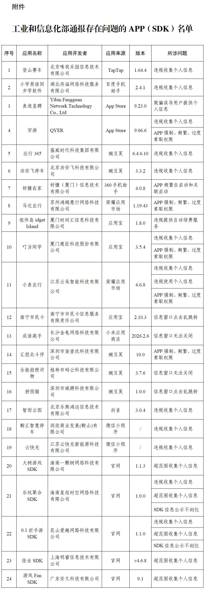 附件:工業(yè)和信息化部通報存在問題的APP(SDK)名單